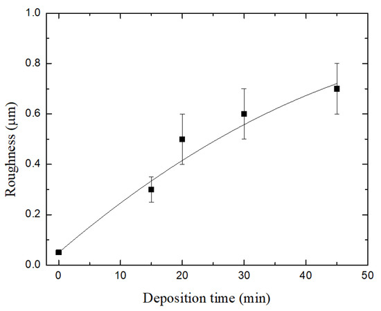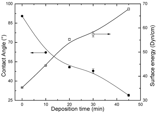 The values of water contact angle and surface energy of the steel substrate exposed to the monomer with the plasma off and the films deposited with various deposition time are shown in Figure 6. As can be observed, the exposure to the plasma causes the contact angle to continuously decrease from 90.2°, measured on the surface not exposed to the plasma, to 28°, after deposition for 45 min. This increment of film hydrophilicity is the result of the enhancement of oxygen-containing groups, which leads to the rise of the surface polarity, and, consequently, to the increase of surface energy, as also shown in the figure, of films fabricated at a higher deposition time [27,38]. That is in agreement with the increase of the intensity of absorptions ascribed to hydroxyl groups with the increase of the deposition time, as shown in Figure 5. Another fact that contributes to the growth of the hydrophilicity is the increasing of film roughness [39] with t, as discussed in the previous sections.
