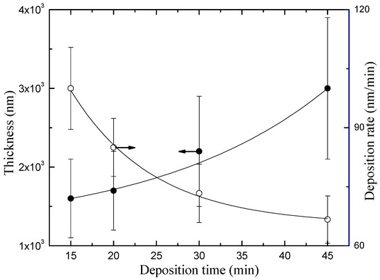 Figure 4 shows the thickness h of the coatings as a function of t. Films as thick 1.6 μm were obtained with a deposition time of 15 min. As the deposition time was increased, h increased, reaching nearly 3.0 μm. Previous studies [27,28] have reported that the thickness of plasma polymerized terpinen-4-ol and linalyl acetate (PLA) thin films using low-pressure radiofrequency plasmas also increases linearly with the deposition time. However, under some deposition times, the thicknesses of the coatings produced there were around one-third of the thickness obtained in our work. It is interesting to mention that, as also shown in Figure 4, the deposition rate, defined as h/t, decreased from 100 to 65 nm/min as the deposition time increased. In order to understand this result, it is interesting to recall that, during the deposition, the sample is exposed to large amounts of atomic oxygen and other reactive species, such as OH and O3, resulting from interactions between the plasma and the air surrounding the samples. Such species may etch the deposited material through chemical reactions, resulting in volatile compounds such as CO and CO2. In addition, the continuous bombardment of energetic species in the plasma may also cause the film densification [29]. Therefore, the results suggest that the higher the deposition time, the higher the influence of plasma on the ablation and densification of the growing material, which may result, for instance, on the holes observed in Figure 2.
