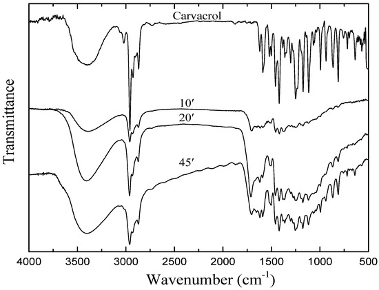 As the deposition time increased, the intensity of almost all absorption increases, which is in agreement with the increase of the film thickness with t, as shown in Figure 4. Furthermore, it is interesting to point out the maintenance of hydroxyl groups on the plasma deposited films. Such radicals, which are involved on the rupture of the bacteria cell membrane, are believed to be one of those responsible for the antimicrobial activity of carvacrol. In addition, when OH containing-phenol rings penetrate the cells, they can disrupt the cytoplasmatic membrane, inhibiting the activity of several enzymes and affecting numerous mechanisms related to cell metabolism [36,37].