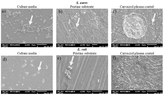 Scanning electron micrographs of colony forming units (CFUs) of S. aureus and E. coli on culture media ((a,d), respectively) as well as on stainless steel samples as-received ((b,e) for S. aureus and E. coli, respectively) and coated with plasma deposited carvacrol films ((c,f) for S. aureus and E. coli, respectively). The arrows indicate the bacterial colonies.