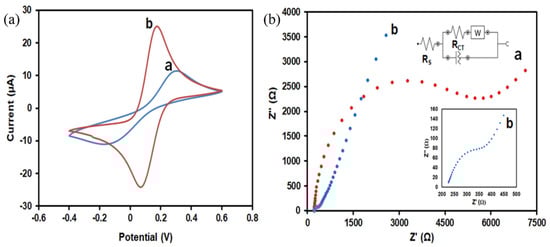 The results were further confirmed by the electrochemical impedance spectroscopy (EIS) technique as shown in Figure 4b. EIS is an efficient method for probing the interfacial properties of surface-modified electrodes [32]. The measurements were recorded in 5 mM [Fe(CN)6]3−/4− containing 0.1 M KCl at an electrode potential of 0.218 V, with a frequency range of 100 kHv to 0.01 Hz, and its equivalent Randle’s circuit. In the Nyquist plots of the EIS, the diameter of the semicircle equals the charge transfer resistance (Rct), which controls the electron transfer kinetics of the redox probe at the electrode surface. As shown in Figure 4b(a), the bare SPCE displays a large semicircle diameter with an Rct value of 12.9 kΩ at the high-frequency region. Meanwhile, the semicircle of the SiNPs/SPCE was significantly reduced with an Rct value of 121 Ω (Figure 4b(b)), demonstrating that the SiNPs-modified electrode surface formed a high electron conductor, which can be ascribed to the excellent conductivity of SiNPs. In summary, the EIS result shows the successful construction of the sensor.