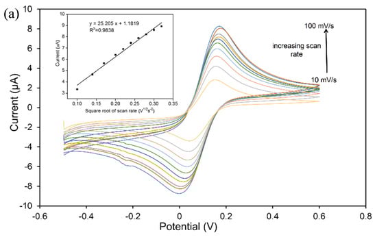 The electrochemical performance of the fabricated sensor was investigated using the CV technique in 5 mM of [Fe(CN)6]3−/4− solution as a redox probe containing 0.1 M KCl as a supporting electrolyte at the potential range of −0.4 to 0.6 V, with a scan rate of 100 mV/s. As illustrated in Figure 4a, the unmodified electrode and SiNPs/SPCE exhibited a pair of well-defined redox due to the oxidation and reduction process of [Fe(CN)6]3−/4−. The SiNPs/SPCE produced a higher peak current compared with the bare SPCE. The anodic and cathodic peak current of the modified SPCE was significantly enhanced after the surface modification with SiNPs. It is probably due to the unique properties of SiNPs, which can increase the surface area and improve the electrode performance of the modified electrode. The peak separation was calculated for both the bare SPCE and SiNPs/SPCE. As can be seen from the result, the SiNPs/SPCE produces a small peak potential separation (0.17 V) compared with the bare SPCE (0.23 V), indicating faster kinetics of the electron transfer rate provided by the SiNPs.