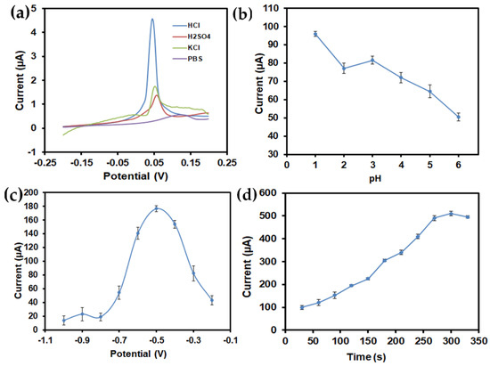 The effect of experimental parameters such as supporting electrolytes, pH, deposition potential, and deposition time were examined in order to gain a high sensitivity of the electrochemical performance of the SiNPs/SPCE towards heavy metal ions, As(III). In the voltammetric analysis, the supporting electrolyte plays a vital role in increasing the conductivity of the analyte solution and maintaining the pH and ionic strength [21]. In this work, different kinds of supporting electrolytes were examined such as 1 M HCl, 1 M Tris-HCl, 1 M PBS, and 1 M KCl. Based on the analysis, 1 M HCl provides the optimum sensitivity and an intense peak current toward As(III) compared with other supporting electrolytes, as shown in Figure 6a. No visible peak current was observed in 1 M Tris-HCl, 1 M PBS, and 1 M KCl. Thus, 1 M HCl solution was selected as the optimized supporting electrolyte due to the sharp stripping peaks current observed.