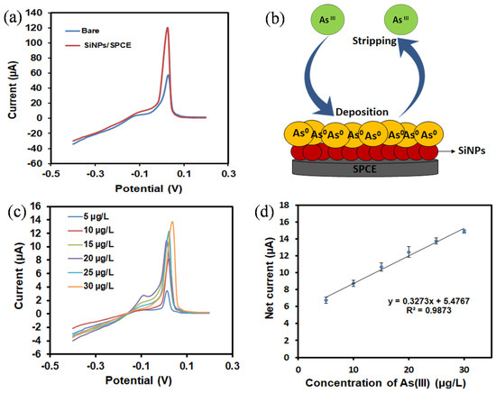 (a) Linear sweep anodic stripping voltammetry (LSASV) responses of the bare SPCE and SiNPs/SPCE in the presence of 1 mg/L As(III) in 1 M HCl solution (pH 1). (b) LSASV sensing mechanism of the SiNPs/SPCE towards As(III) detection. (c) LSASV responses of the SiNPs/SPCE towards As(III) in a concentration range of 5 to 30 µg/L and (d) the corresponding linear calibration plots of the net current against As(III) concentrations.