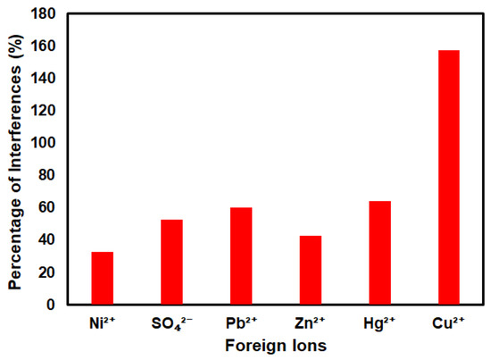 Studies of a possible interference from foreign ions that exist in natural water have been conducted. Figure 8 shows the effect of various foreign ions such as Hg2+, SO42−, Pb2+, Zn2+, Ni2+, and Cu2+, which were tested for the interference study of the SiNPs/SPCE-modified electrode under optimum conditions. The degree of interference was studied by adding some possible interfering metals into 1 M HCl containing 10 µg/L As(III) at 1:1 of the As(III) concentration to foreign substances. The results show that the fabricated sensor has good selectivity towards As(III) ions. Only Cu(II) ions were found to suppress the peak current. It is due to the natural existence of Cu(II) in the water system, and it was found present in relatively high levels in the world’s water supply. During the deposition step in the electrochemical measurement, copper and arsenic were co-deposited on the electrode and formed an intermetallic compound Cu3As2 alloy [49]. Thus, due to this reason, Cu(II) shows a significant interference in arsenic detection. This finding is in good agreement with previous studies that reported a major interference from Cu(II) ions in the electrochemical detection of As(III) in water [49].