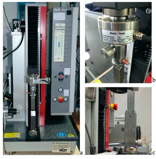 (a) Universal testing machine. The machine consists of (b) a load cell, in charge of measuring pressure and traction; and a motor, in charge of placing the cell at the appropriate distance. In addition, it consists of the (c) supports in charge of simulating 3-point bend test.