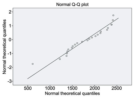 Using Q–Q graphs of normality (Figure 2) and the Shapiro–Wilk test, it was verified that the data fit the Gauss model of normality (p > 0.05). The statistical normality fit was confirmed, which allowed the use of a parametric test as the statistical method of comparison between groups. All the studied variables were sufficiently close to the Gaussian normality model.