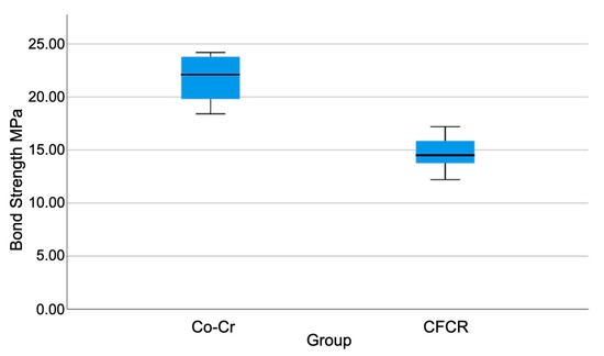 Statistically significant differences (p < 0.01) were observed in the bond strength values following the Mann–Whitney U test, obtaining higher values in the Co–Cr control group (21.71 ± 2.16 MPa) against the CFRC test group (14.50 ± 3.50 MPa). The highest value (24.20 MPa) was found in the Co–Cr group while the lowest value (6.10 MPa) was observed in the CFRC group (Figure 3).