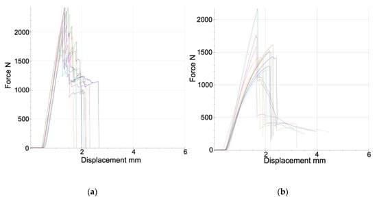 Force–displacement diagrams. (a) Cobalt–chromium frameworks with ceramic veneering (Co–Cr), (b) carbon-fiber framework with resin veneering (CFRC).