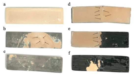 Failure analysis of (a) metal–ceramic specimen before testing; (b) mixed fracture in metal–ceramic specimen; (c) adhesive-type fracture in the metal–ceramic specimen, a complete chipping from the Co–Cr structure occurs; (d) cohesive fracture in carbon-fiber reinforced composite specimen, fracture only occurs in the internal layer of the composite resin; (e) mixed fracture in carbon-fiber reinforced composite specimen; (f) adhesive fracture in carbon-fiber reinforced composite specimen, a complete chipping of the coating material from the carbon-fiber framework occurs.