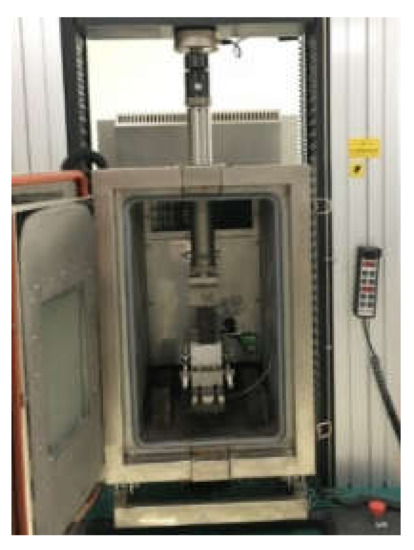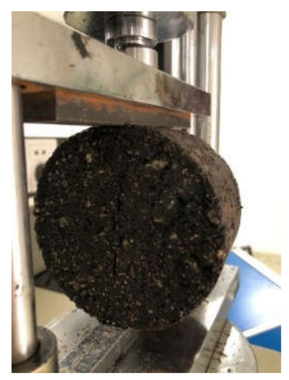 The ITS of the mixture was tested according to the splitting test method (JTG E20-2011, T0716-2011) [2]. The samples were placed in a thermostatic water bath at 15 ± 0.5 °C and immersed in water for 2 h. Then, the test samples were removed from the sink and the surface was wiped clean. The test samples were placed on the loading table for testing, and the loading speed was 50 ± 5 mm/min. Four parallel samples were tested for the same type of mixture. ITS test is shown in Figure 4.