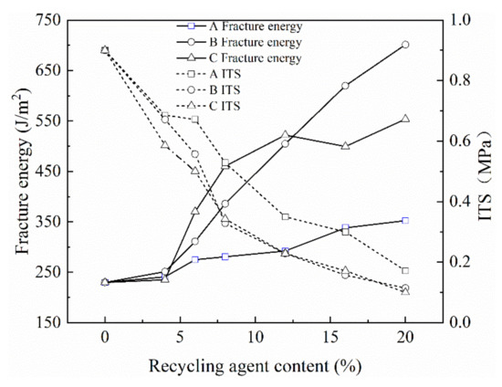 The effect of recycling agent on the fracture energy and ITS of the mixture.