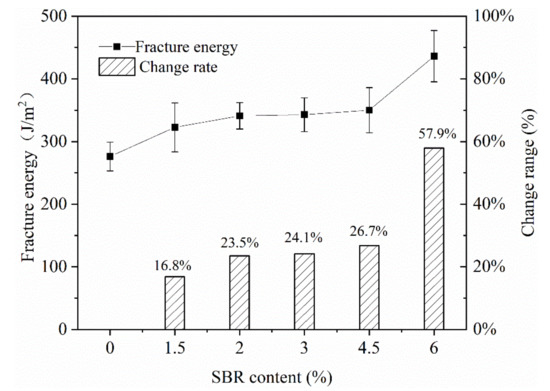 In this study, the different contents of SBR latex were used to improve the low temperature crack resistance of the mixture. SBR latex was added by 0 wt%, 1.5 wt%, 2 wt%, 3 wt%, 4.5 wt% and 6 wt% of the emulsified asphalt. It can be seen from Figure 6 that as the content of SBR latex increased, the fracture energy of CRME gradually increased. However, when the content of SBR latex added was between 1.5% and 4.5%, the fracture energy of the mixture increased by 16.8% to 26.7%, and the change range was limited. When the content of SBR added reached 6%, the increase in fracture energy was larger, reaching 57.9%. In practical engineering applications, considering the high price of SBR latex, the high content of SBR would greatly increase the material cost of a cold recycled mixture. Therefore, it was recommended that the content of SBR latex was 2–3%.