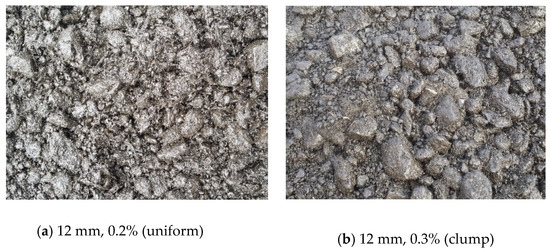 It can be seen from Figure 8 of the mixing effect of the mixture that the mixture with the addition of 6 mm fibers was more uniformly mixed. When the content of 12 mm fiber added increased from 0.2% to 0.3%, the mixture began to appear uniformly dispersed and obviously agglomerated from being relatively uniform. Therefore, it was recommended to use 12 mm basalt fiber to improve the low temperature crack resistance of the mixture, and the addition content should be 0.2%.