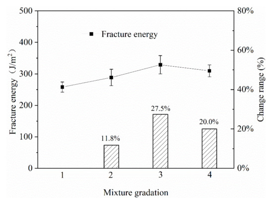 It can be seen from Figure 10 that in gradation 3, when the pass rate of 4.75 mm was 40%, an inflection point appeared in the fracture energy curve. When the pass rate of 4.75 mm increased from 32.2% to 40%, the fracture energy of the mixture gradually increased. When the pass rate of 4.75 mm reached 45.2%, the fracture energy of the mixture showed a downward trend. Compared with the gradation with a pass rate of 4.75 mm of 32.2%, the rupture energy was increased by 27.5% when the pass rate of 4.75 mm was 40%, indicating that the thickness of the mixture gradation had a significant effect on the fracture energy of the mixture.
