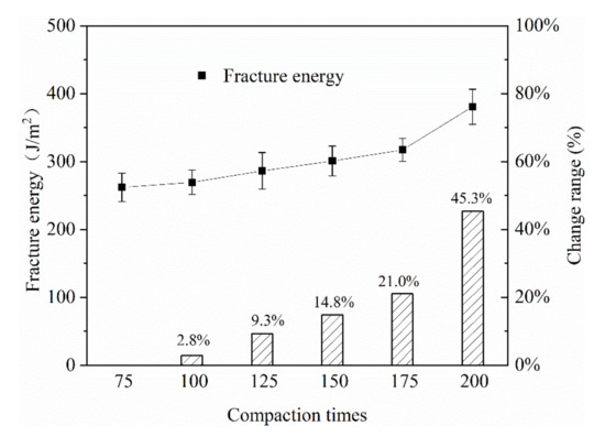 It can be found from Figure 15 that as the number of mixture compactions increased, the fracture energy shows a gradually increasing trend. Compared with the first compaction times of 75 times, when the compaction work reached 200 times, the fracture energy of the mixture was increased by 45.3%, and the improvement effect was very significant.