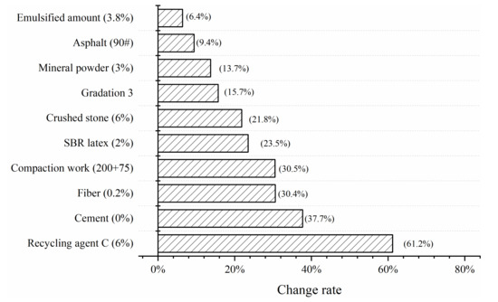It can be seen from Figure 16 that the biggest factor affecting the fracture energy of CRME was the recycling agent, which affected more than 70%. Followed by cement, fiber, compaction work and the degree of influence was between 30% and 40%. SBR latex, crushed stone, gradation and mineral powder were arranged in the back, and the degree of influence was between 10% and 25%. Asphalt designation and emulsified asphalt content had the smallest impact on fracture energy, with an impact of less than 10%.