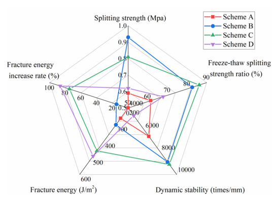 According to the above four formulas, a complete set of tests were conducted on the mixture void ratio, ITS, freeze–thaw ITS ratio, dynamic stability and fracture energy. The test results are shown in Table 7 and Figure 17. It should be noted that only the large Marshall test samples was used in the SCB test, and the rest of the mixture test used the standard Marshall test.