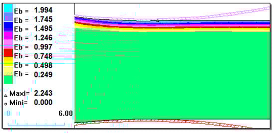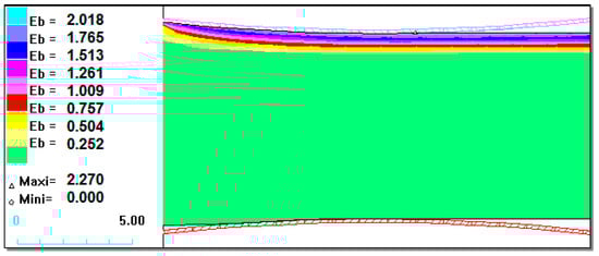 Figure 3, Figure 4 and Figure 5 show that for the 1.2 mm thickness coating, a different state of strain was observed than for the 0.6 mm and 0.9 mm coatings. The maximal values of the replacement strain for smaller coating thicknesses (Ni–5%Al) occurred directly at the contact of the material with a roller, whereas for a 1.2 mm thickness coating (Figure 5), it occurred under the contact surface at the Bielajew’s point [16,33,34,35,36,37,38]. This distribution of strain intensity can cause possible delamination as result of loss of cohesion of the coating material or loss of coating adhesion in the actual rolling process. On the basis of the computer simulations carried out, we could certify that with the application of small values of relative draft (5%) and for a coating thickness of 0.6 mm (Figure 3), there was a uniform distribution of strains, which should provide good adhesion of the coating to the base during plastic working [13,39]. This has been confirmed in experimental studies. During the rolling process and already after its completion, the Ni–5%Al alloy coating was characterized by very good adhesion to the base. This was confirmed by qualitative methods of coating adhesion tests, which showed that rolling did not remove their adhesion to the steel base.