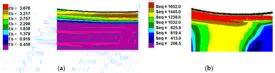 State of strain and stress in the Ni–5%Al coating after the burnishing process for a 0.6 mm coating thickness: (a) strain intensity; (b) stress intensity in MPa.