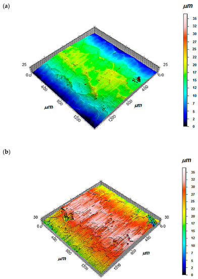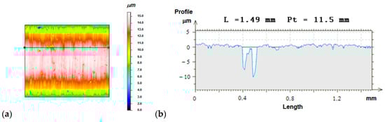 Figure 13 shows an example of the roughness profile of the composite coating surfaces together with the contour map after burnishing. Topography was evaluated using a Hommel-Etamic T8000 profilometer. The length of the measuring section was 1.5 mm; step 2.5 mm; number of steps 500; measuring resolution in the longitudinal direction 0.002 μm; and measuring tip radius 2 μm.