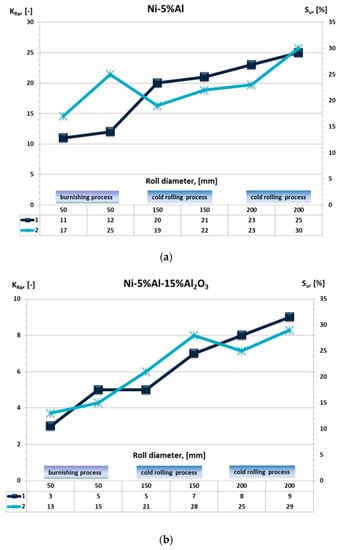 Figure 14 shows the results of the value of strengthening and reducing roughness. The alloy and composite coatings achieved a lower roughness and higher hardness after plastic working. It can be seen that for larger roll diameters, higher (KRa) values were obtained and corresponded to the strengthening (Su) value. Along with the increase in the diameter of the roller value, the surface layer of coatings was strengthened, which is characteristic of the composite coatings of Ni–5%Al–15%Al2O3. Using burnishing for finishing the alloy coatings of Ni–5%Al, reinforcement values comparable to those after the cold rolling process can be obtained.