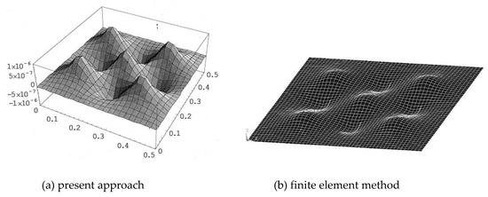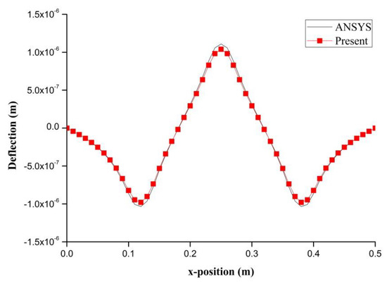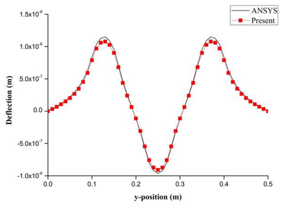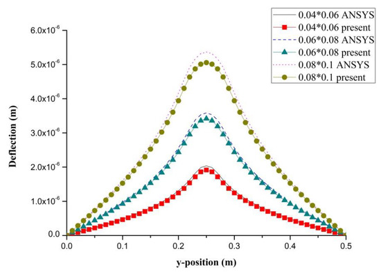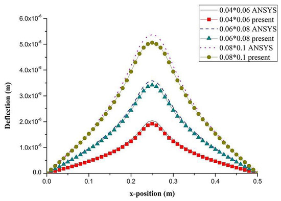 PZT actuator was surfaced bonded on the central area of a composite laminate plate with three different sizes of 40 × 60 × 0.5 , 60 × 80 × 0.5 , and 80 × 100 × 0.5 , as shown in Figure 3. The bending moments exerted on the composite laminate induced by the PZT actuator were calculated using Equations (20) and (21), resulting in and . After substituting the bending moments into Equation (32), the deflection of the composite laminate plate was readily determined using Equations (34) and (31). Figure 4 plots the deformation of the composite laminate plate induced by a PZT actuator with dimensions of 40 × 60 × 0.5 mm3. Finite element software ANSYS 2020 (ANSYS Inc., Canonsburg, PA, USA) was employed to verify the present approach. In the finite element analysis, SOLID 5 and SOLID 45 elements were adopted for the PZT actuator and composite laminate, respectively. Figure 5 illustrates the 3D finite element mesh. The load exerted on the PZT actuator was a voltage employed between the upper and lower surfaces of the SOLID 5 elements, leading to an electric field along the poling direction of the actuator. Figure 6 and Figure 7 plot the deflections of the composite laminate plate induced by a PZT actuator with three different sizes along the horizontal line y = 0.25 m and vertical line x = 0.25 m, respectively. It can be observed that the deformation of the composite laminate plate predicted by the present approach agrees well with the finite element results. The deflection is increasing with the increase of the PZT size.