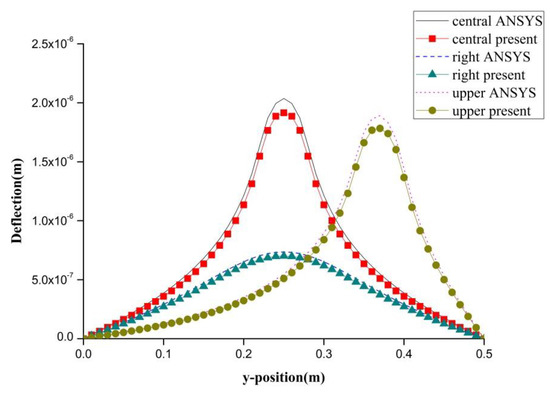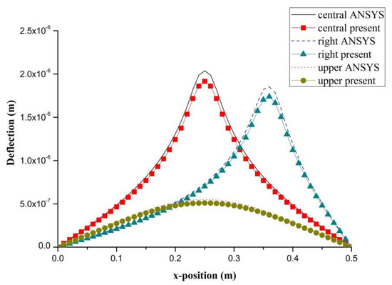 Deflection along the horizontal line (y = 0.25 m) of the composite laminate plate induced by a PZT actuator at three different locations.