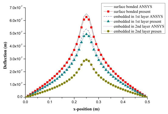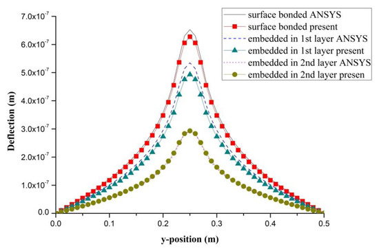 PZT actuator was embedded in a composite laminate with stacking sequence of [0/90/0. The dimensions of the PZT actuator and Boron/Al layer were 40 × 40 × 0.625 mm3 and 500 × 500 × 1.25 mm3, respectively. PZT actuators were embedded in the first and second layers located at the center of the composite laminate, as shown in Figure 12. In addition, PZT actuator surface bonded on the composite laminate was also included as reference. The deflections of the composite laminate plate along the horizontal line (y = 0.25 m) and vertical line (x = 0.25 m) induced by the embedded PZT actuator are presented in Figure 13 and Figure 14, respectively. It can be observed that the deflection of the composite laminate is decreasing with the increase of the PZT embedded depth. The deformation induced by the surface bonded PZT actuator is larger than that of embedded PZT actuator. A close agreement between the present approach and finite element result demonstrates that the proposed approach can be used to predict the deformation of a composite laminate plate induced by a series of distributed PZT actuators.