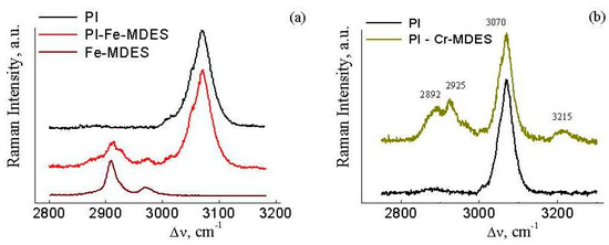 We studied the changes in the vibrational spectra after filling PI with the mentioned metalalkoxysiloxane precursors with a concentration of 14 wt.%. The νCH region of the Raman spectra for the PI, PI-Fe-MDES films and Fe-MDES is shown in Figure 1a. The presence of the filler in the composites wasconfirmed by the appearance of the new bands in the Raman spectra, at ~2910 and ~2970 cm−1, corresponding to the methyl groups in the Si atoms (νCH3). The γ-aminopropyl group in the composite PI-Cr-MDES was preserved, as indicated by the Raman spectrum shown in Figure 1b (νCH bands at ~2890 and ~2925 cm−1 and νNH broad band near ~3215 cm−1). The other vibrational bands of the filler with the polar skeletal bonds in the Raman spectra of the composites were weaker in comparison to the intense PI Raman spectrum and were therefore not detectable.