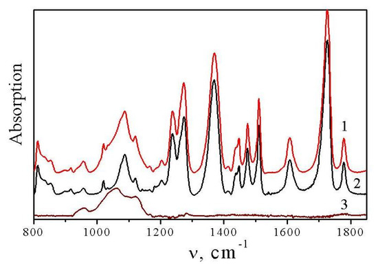 IR spectra of the films (on KBr plates) in the region 800–1800 cm−1 of PI-14 wt.% Fe-MDES (1), PI (2) and the difference spectrum (3), proving the presence of Fe-MDES in the composite (a broad band 900–1150 cm−1 in the difference spectrum).