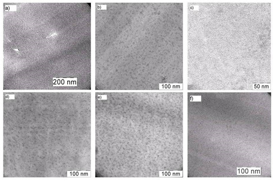 TEM images of nanocomposites on base PI and metalloalkoxysiloxane precursors: Al-MDES (a), Fe-MDES (b), Cr-MDES (c), Zr-MDES (d), Hf-MDES (e) and Nb-MDES (f). Precursor concentration is 14 wt.%.
