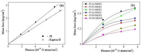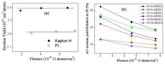 Figure 5a shows the dependence of the erosion yields (Ey) of Kapton H and organosoluble PI, and Figure 5b shows the relative erosion yields of the composites (Erel=Eyc/Eyp, where Eyc and Eyp denote the erosion yields of filled and unfilled PI, respectively) on the fluence AO. For the unfilled polymers, the Ey values did not change with increasing AO fluence; the values were 3.0 × 10−24 cm3/atom and 2.4 × 10−24 cm3/atom for the Kapton and PI, respectively. The dependence of Erel on the AO fluence determined using the experimental data of Δm/S on F could also be divided into three groups. For the first (PI-Al-MDES and PI-Cr-MDES), second (PI-Fe-MDES and PI-Zr-MDES) and third (PI-Hf-MDES and PI-Nb-MDES) groups of the filled PI films, the Erel values decreased to 18%, 13% and 8% with increasing AO fluence. Therefore, filling the polymer with particles composed of BFMSO can reduce the erosion yield by 82–92%.