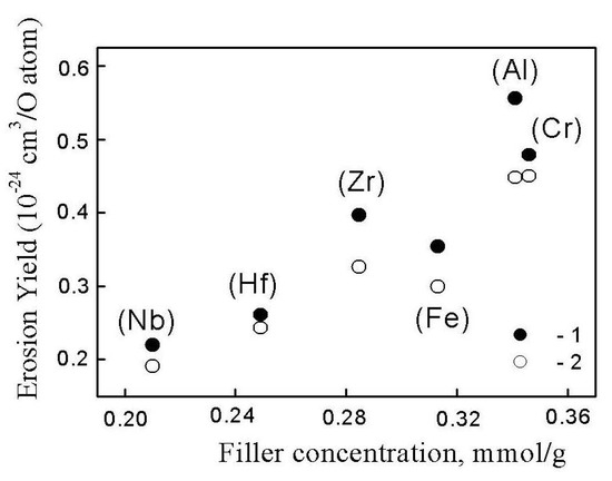 Erosion yields of PI nanocomposites obtained using M-MDES precursors (M = Al, Fe, Cr, Zr, Hf and Nb) on the filler concentration. The AO fluence is 5.6 × 1020 (1) and 7.6 × 1020 atoms O/cm2 (2).