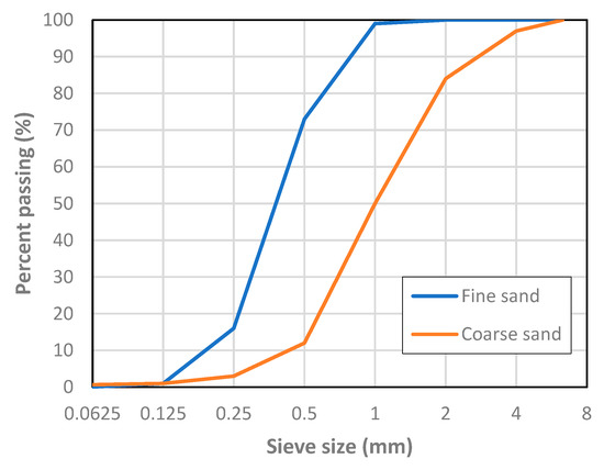 Cementitious matrices composed of cement, sand, water and superplasticizer were designed. The cement type was CEM I, ordinary portland cement, of the strength class 42.5R, conforming to EN 197-1 [42], with a specific gravity of 3.14 g/cm3. Fine and coarse natural siliceous sands with a specific gravity of 2.63 g/cm3 were used. Figure 1 depicts the particle size distribution of both sands. To prevent scale effects, the maximum aggregate size, 4 mm, was less than 1/3 of the least dimension of the specimens. The larger than usual grain size also allows matrix shrinkage to be limited [15].