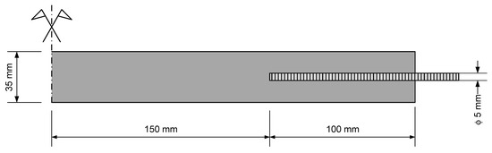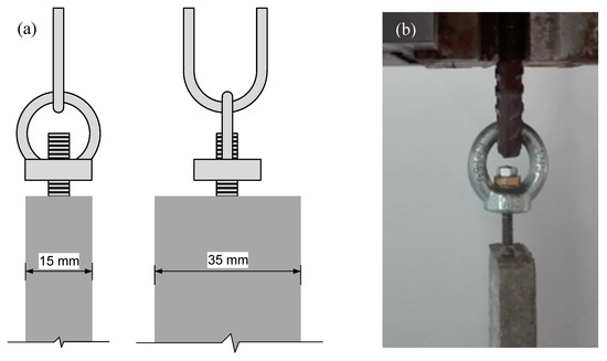 For each mix, three prisms of 40 × 40 × 160 mm3 were cast in steel molds, compacted by means of a vibrating table. After demolding (at 24 h) these specimens were kept in water at 20 °C. Further, four 15 × 35 × 500 mm3 ties were cast for uniaxial tensile testing. The dimensions of the ties are within the range found in the literature [37,45,46,47,48,49,50,51]. The thickness is more than three times the maximum aggregate size, to avoid scale effects. The width-to-length ratio of the ties ensures the development of stabilized cracking, if the reinforcement ratio accomplishes the minimum required for control of cracking and makes the Poisson effect quite limited [47]. Based on the approach followed by Jaccoud [52], at both tops threaded rods with 5 mm diameter were embedded in the specimen to a length of 100 mm (Figure 2). The rod diameter and embedded length were designed to ensure a proper load transfer from the universal machine clamps to the specimens.