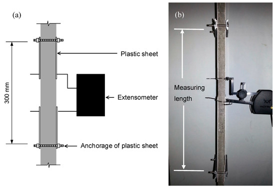 Tests were conducted using a screw-driven universal test frame Instron 5900-R (Instron, Norwood, MA, USA), equipped with a 10 kN load cell capacity (class 0.5). The tension load was applied under displacement control at a rate of 0.5 mm/min, common within this type of testing [33,40,50]. To improve the accuracy of the axial deformation measurement, a clip-on extensometer Instron 2630-112 (Instron, Norwood, MA, USA) with a gauge length of 50 mm and a travel range between −2.5 and +25 mm was used. The accuracy (0.5%) is relative to the gauge length. Thus, an accuracy of ±25 µm is ensured. The measuring length was 300 mm, to encompass any crack formed during the test. Given the difference between the gauge length and the measuring length, the extensometer was clipped over plastic sheets, which were anchored to the specimen at the limits of the measuring length, as depicted in Figure 4.