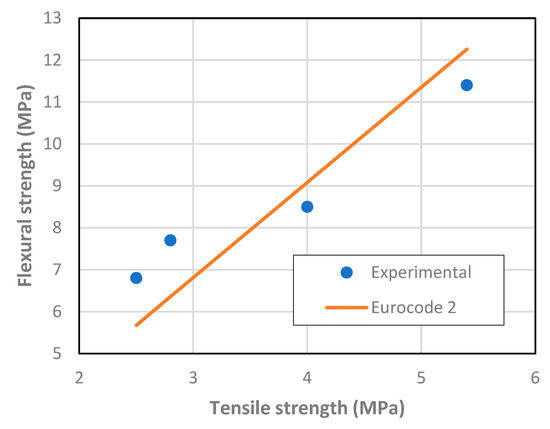 The strength results are summarized in Table 2. There are consistent increases in strength with the reduction of the water-cement ratio. Further, in Figure 6 and Figure 7, the relationship between the tensile strength and the flexural and compressive strengths are shown, respectively.
