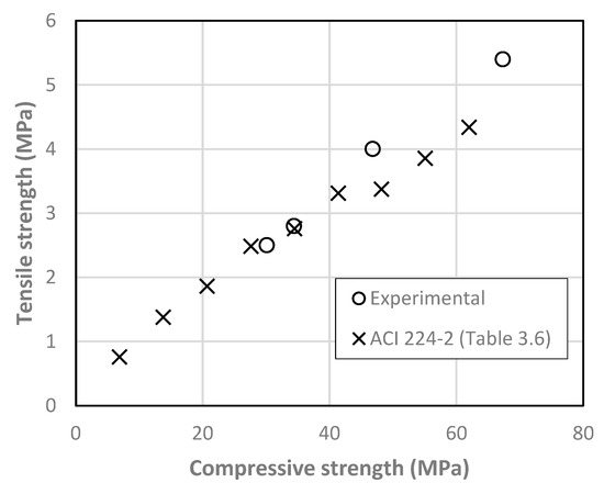A good agreement is found with existing relationships in reference documents [60,61]. From Figure 7 it can be roughly estimated that tensile strength corresponds to 8% of the compressive strength.