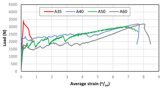 Regarding average strain at peak load, similar values are present in A60 and A40, while for A50 the value is a bit smaller (in agreement with the ultimate load variation). Obviously, the strain at peak load for A35 is a lot smaller because it corresponds to matrix strain at maximum tensile stress.