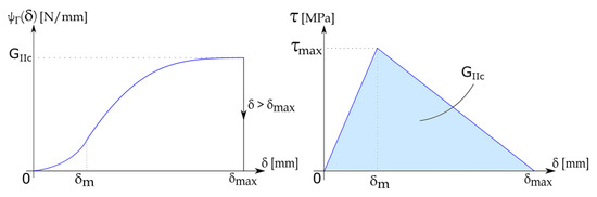 - fracture energy densitywhere the constant represents the fracture energy of each layer, whereas is a length parameter that defines the width of the transition zone between the damaged and the undamaged zone in the i-th layer. A parameter representative of the material strength is defined as .