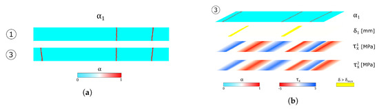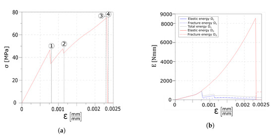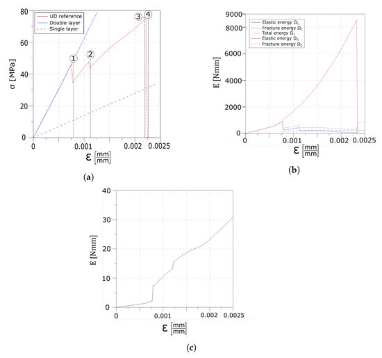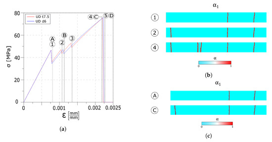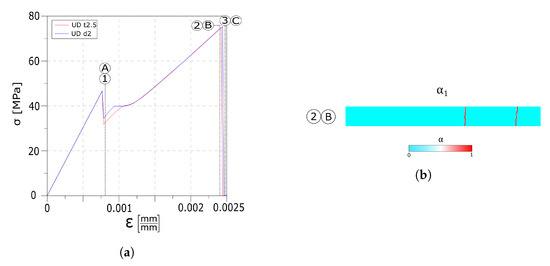 The overall stress–strain responses of Figure 12a show a similar behaviour compared to the one observed in the reference value test up to point 1. Increasing the strain leads to the formation of the second crack set (point 2 and point B). Once the second crack set is formed, in the UD tau7.5 test, the higher value of the interface maximum stress allows the formation of a third crack set, as shown by the third drop in the stress diagram (point 3 in Figure 12a). The linear path of the diagram, up to complete failure in both the curves, indicates that no delamination of the interfaces takes place.