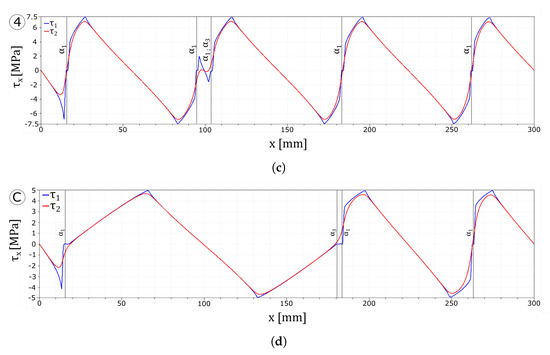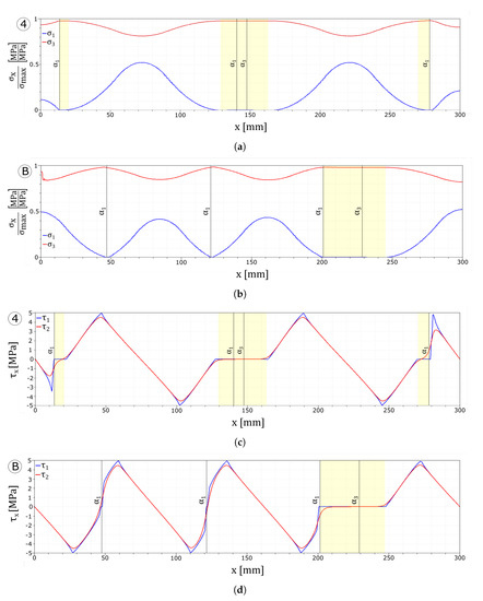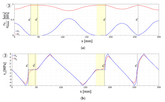Figure 6 shows stress values in the glass plies normalised with respect to the maximum tensile strength of the corresponding layer and the stress profiles along the interfaces. The yellow highlighted zones correspond to the delaminated areas in the first interface, while vertical lines are placed in correspondence with the crack positions for each layer. Here, the mechanical behaviour of the laminated glass beam can be better appreciated. In particular, Figure 6a shows that the presence of cracks in the first layer leads to zones in the tempered glass characterised by high stress values. Moreover, from Figure 6b, it can be noticed that in these glass portions delamination is also present and the interface stresses are null. In fact, the relative displacement is higher than and no load is transferred to the first layer. Far from the delaminated zones, the interlayer permits the transfer of a portion of the load between the two glass plies, as the interfaces stress profiles follow a similar path along the beam length.