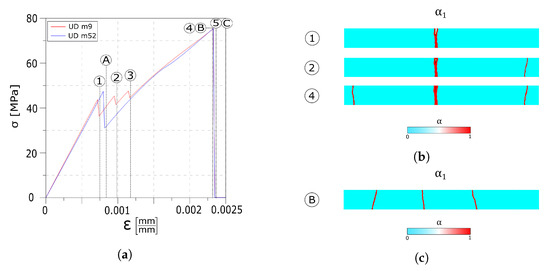 Numerical results: (a) Global stress–strain response. (b) UD m9 crack evolution overview in the first layer. (c) UD m52 crack evolution overview in the first layer.