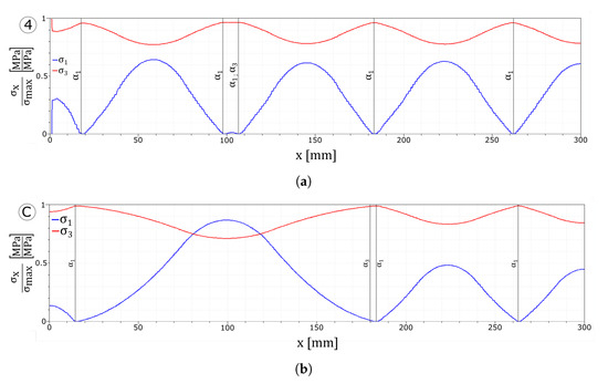 Figure 8a,b reports the stresses in the glass layers normalised with respect to their tensile strength. The interface stress values, reported in Figure 8c,d, as in the previous simulation, vanish in the delaminated areas close to the cracked zones and transfer load to the undamaged parts of the float glass ply.
