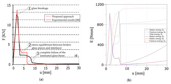 Here, the results of the four-point bending test are presented and compared to the experimental evidence illustrated in [40]. Figure 14a reports the load–displacement curve plot, whereas the energetic contribution of each layer is drawn in Figure 14b.