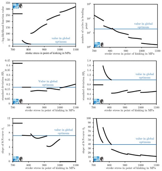 . This is understandable if one considers that the maximum likelihood method with a normal distribution is identical to least squares if no run-outs are present. Basically, a lot of measured error is created in the process of fitting the curve below the kink point because the curve just cannot fit well as the slope is fixed. Some of the error is transferred from the part of the model below the kink point to the part above the kink point. This can be seen in the rise in the number of cycles in the kink point, while the stress in the kink point is mostly constant,