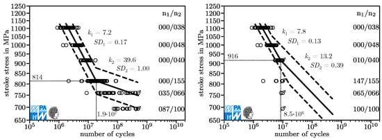 Standard deviation below the kink point, , varies widely. One reason for its growth is that failures at the lowest load levels do not follow a log-normal distribution and have a higher scatter range than failures at medium load levels. If the data are artificially censored at a relatively low number of cycles, the lowest load levels are only factored in as run-outs. Run-outs occurring at cycle counts below the expectation value do not contribute positively to a greater standard deviation.