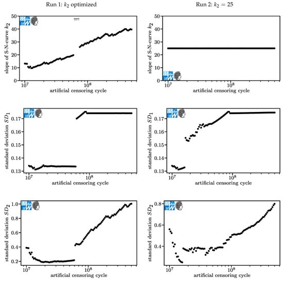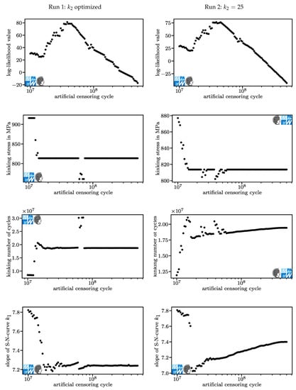 The points at the same artificial censoring cycle in different diagrams of the same run refer to the same model. The log-likelihood value is higher for Run 1 because one additional parameter could be varied. The only case where the log-likelihood value of Run 1 would be equal to that of Run 2 is if for Run 1, , which implies that both models are equal. For artificial censoring cycles over 4·10, the likelihood function falls approximately linearly (log-lin). This is mostly caused by run-outs moving towards higher numbers of cycles in a mostly constant model and thereby reducing the computed residual likelihood of fracture .