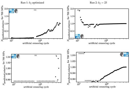 in Run 2. Here, even the prediction of the model based on the original dataset is inadmissible for fatigue design. The assumption of a correct value of 1.0 appears not to be reasonable here. For Run 1, we see very conservative results for low artificial censoring cycles with relative lifetime prediction more or less continuously rising to 1.0 towards higher artificial censoring cycles. An exception to this is the range around 6.5·10